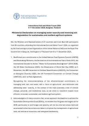 DocumentOther documentDéclaration ministérielle sur la gestion de la pénurie d’eau et les moyens d’enrayer la dégradation des sols pour des systèmes agroalimentaires durables et résilients 2025La « Déclaration ministérielle sur la gestion de la pénurie d'eau et les moyens d’enrayer la dégradation des sols pour des systèmes agroalimentaires durables et résilients » a été approuvée par les ministres et les représentants de 27 pays participant au Forum international sur les sols et l'eau 2024, coorganisé par l'Organisation des Nations unies pour l'alimentation et l'agriculture (FAO) et le gouvernement royal de Thaïlande à Bangkok, Royaume de Thaïlande, du 9 au 11 décembre 2024. Il réaffirme l'engagement collectif à prendre des mesures urgentes pour faire face à la pénurie d'eau et enrayer la dégradation des sols afin d'accélérer la transformation vers des systèmes agroalimentaires plus efficaces, plus inclusifs, plus résilients et plus durables.