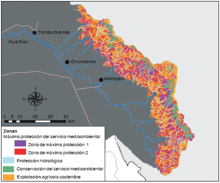 Los oferentes de servicios determinados eran propietarios de tierras situadas en la parte alta de la cuenca del río Piura que estarían en condiciones de mantener o mejorar la calidad de las aguas mediante prácticas idóneas o un uso de la tierra diferente. Estos oferentes serían remunerados por servicios varios de reforestación y ordenación de zonas reforestadas, conservación de bosques o adopción de prácticas agroforestales. El territorio en que se encontraban los oferentes se dividió en diversas zonas de acuerdo con un modelo de planificación física diseñado según la metodología de Jiménez et al. (2006) (Figura 3), a saber:
