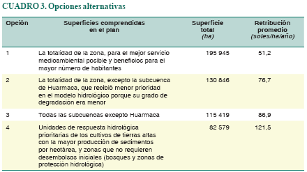 Basándose en los ingresos de los compradores de servicios que viven en la ciudad de Piura, y suponiendo que todas las propiedades de la cuenca han sido adscritas al sistema de pagos por servicios medioambientales, se calculó la cantidad promedio que podía pagarse por hectárea en concepto de coste de oportunidad. Se establecieron cuatro opciones alternativas con arreglo a las porciones decrecientes de superficie de cuenca (Cuadro 3). La suma promedio por pagarse por hectárea se ajustaría de acuerdo con los diferentes contratos firmados por los propietarios y dependería del tipo de tierras en su posesión y de los intereses específicos de cada propietario.