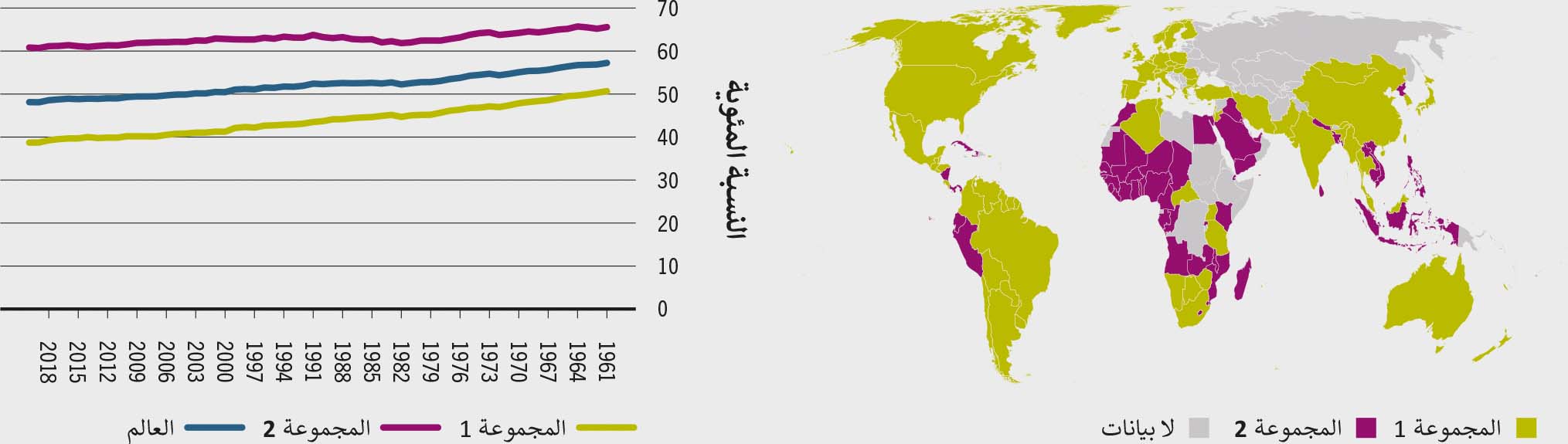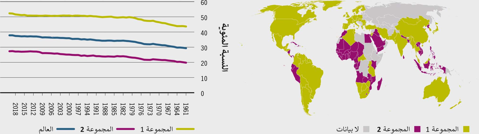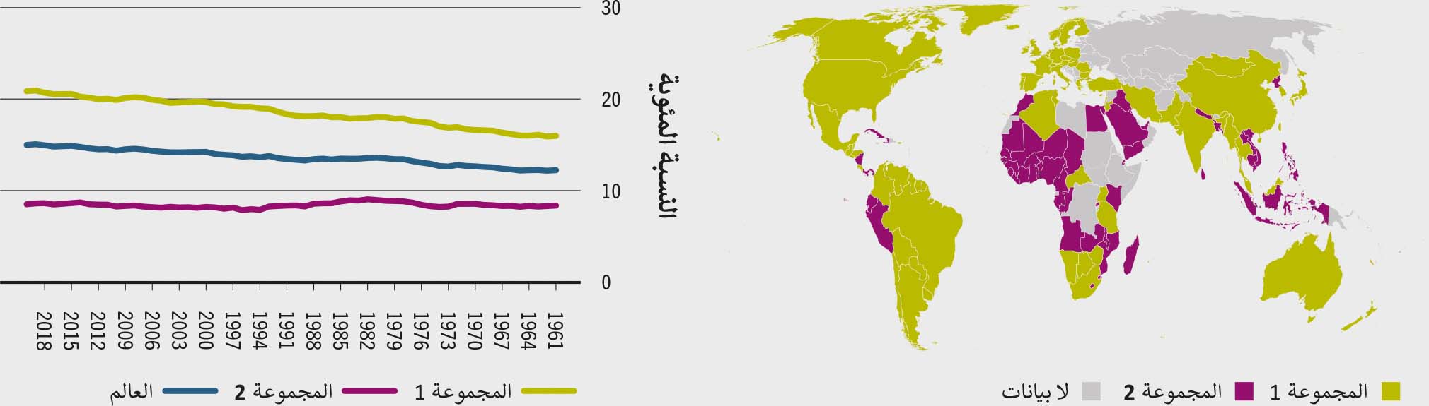 وتتسم المجموعة 1 بحصص منخفضة ومتناقصة من المواد الغذائية الأساسية، وحصص مرتفعة ومتزايدة من الأغذية الحيوانية المصدر وحصة إجمالية أعلى من الأغذية الحيوانية المصدر، والدهون والزيوت، والحلويات والمشروبات في إجمالي السعرات الحرارية المتاحة للاستهلاك (الشكل 1-8 إلى الشكل 1-10). وفي هذه المجموعة، تتقارب الأنماط الغذائية للبلدان في ما بينها وتقترب من متوسط الحصة العالمية. وتبيَّن أن البلدان في المجموعة 2 تمتلك، في المتوسط، حصة أعلى بكثير من المواد الغذائية الأساسية وحصة إجمالية أقلّ من الأغذية الحيوانية المصدر والدهون والزيوت والحلويات والمشروبات، وهي تلحق بالمتوسط العالمي بمعدل أبطأ.