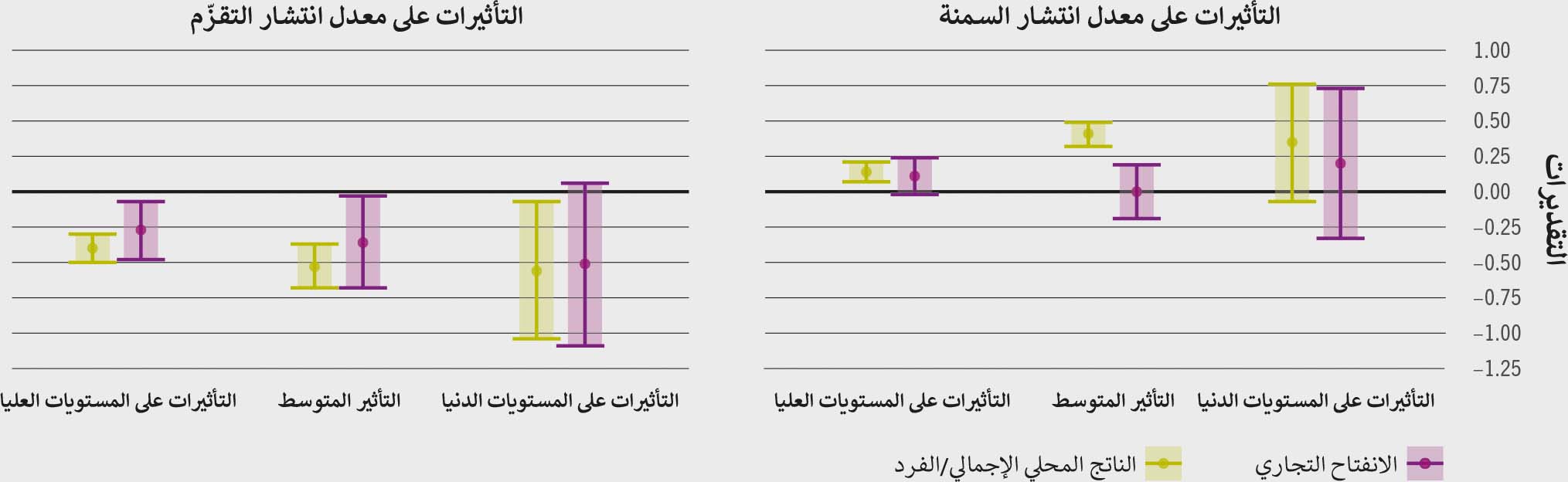 الشكل 2-12متوسط تأثيرات انفتاح تجارة المنتجات الغذائية ونصيب الفرد من الناتج المحلي الإجمالي على معدل انتشار السمنة لدى البالغين ومعدل انتشار التقزّم لدى الأطفال