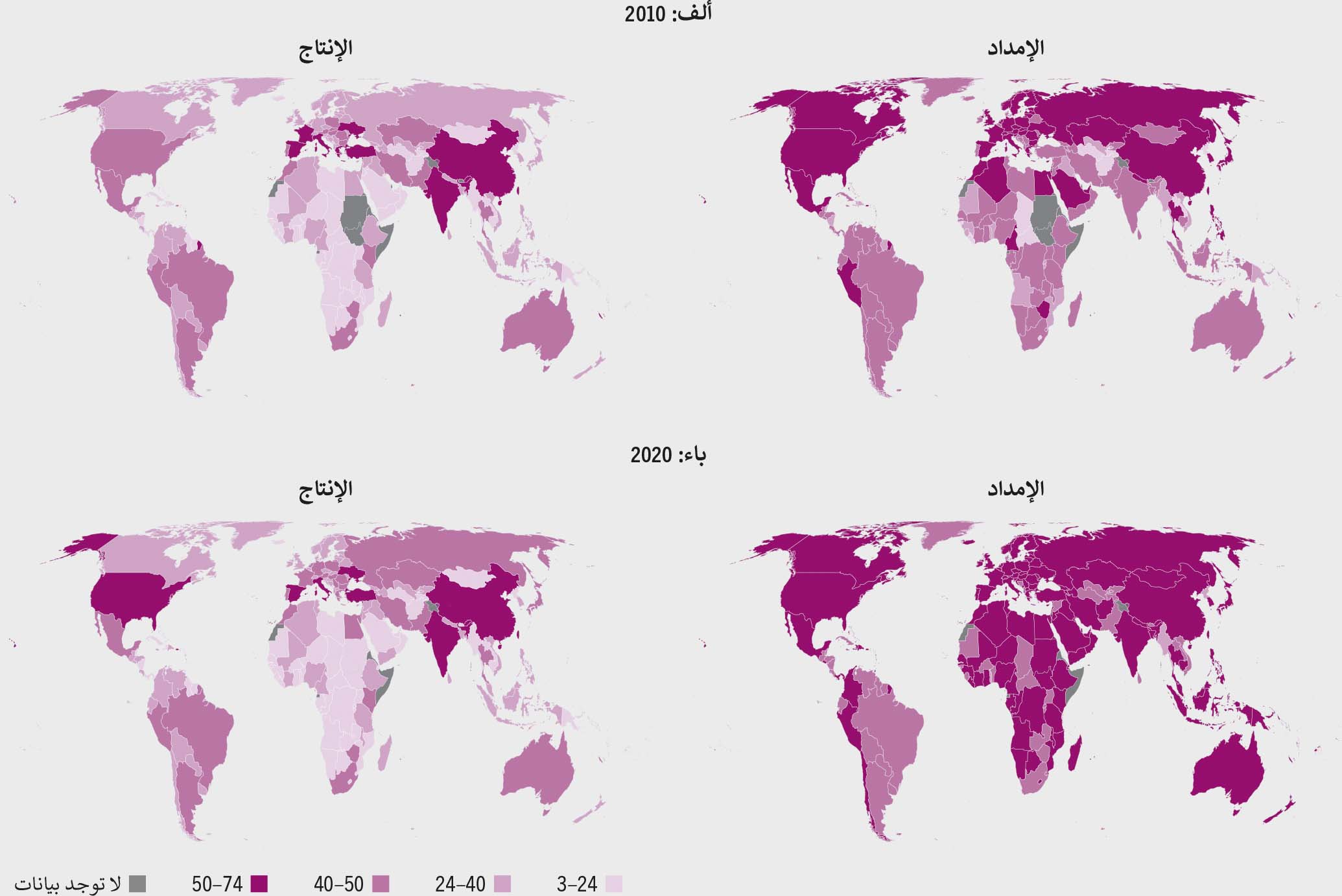 تستند التحليلات الكمية في هذا التقرير إلى العديد من مصادر البيانات، وأهمها قاعدة البيانات الإحصائية الموضوعية في منظمة الأغذية والزراعة. وسعيًا إلى التعبير عن التجارة في المغذّيات الكبرى والدقيقة، حُوِّلت بيانات التجارة الثنائية التابعة لقاعدة البيانات الإحصائية الموضوعية في منظمة الأغذية والزراعة عن الأعوام 2021-2000 إلى قيم الطاقة والمغذّيات باستخدام جدول عالمي بشأن تحويل المغذّيات أُعدَّ في الآونة الأخيرة.158 وتمّ جمع تدفقات التجارة ضمن ثماني فئات غذائية (انظر الإطار 2-1) وأربعة مستويات تجهيز (انظر الإطار 2-2). وطُبِّقت التحويلات نفسها على حسابات استخدام الإمدادات لقاعدة البيانات الإحصائية الموضوعية المذكورة عن الفترة الممتدة بين عامي 2010 و2020.