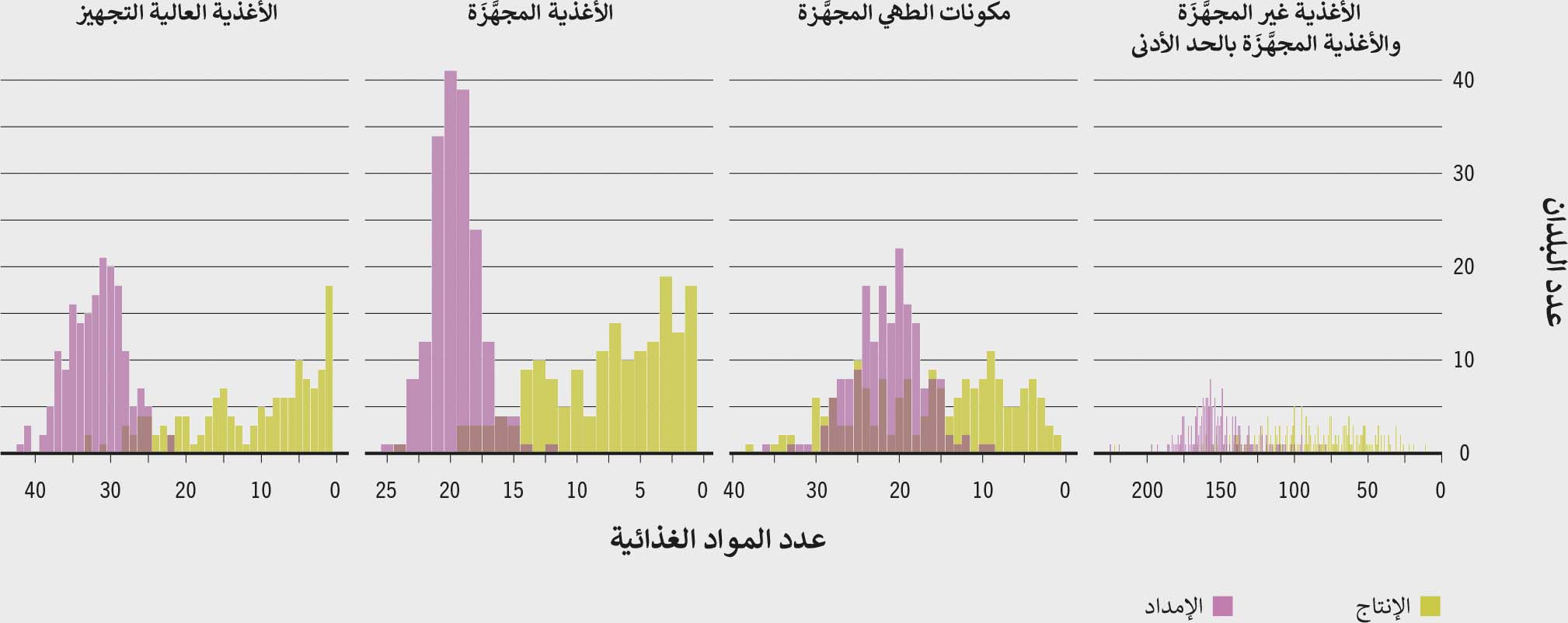 وعلى مستويات تجهيز أعلى، ثمة عدد أقل من المواد الغذائية؛ ومع ذلك، يظهر نمط مماثل مع التجارة، وبصورة محددة أكثر الواردات، ما يؤدي إلى تنوع أعلى في الأغذية المتاحة للاستهلاك من تنوع الأغذية المنتَجة محليًا. وفي عام 2020، استوردت البلدان في المتوسط ما يصل إلى ضعف عدد الأغذية غير المجهَّزَة والأغذية المجهَّزَة بالحد الأدنى ومكونات الطهي المجهَّزَة المختلفة مقارنةً بما أنتجته. وبما أن صناعة تجهيز الأغذية ليست متطورة في جميع البلدان، استوردت البلدان في العام نفسه ما يقرب من ثلاثة أضعاف عدد الأغذية المجهَّزَة والأغذية العالية التجهيز مقارنة بما أنتجته. وأدت التجارة على نحو مستمر إلى تنوع أعلى في الأغذية المتاحة للاستهلاك مقارنة بالأغذية المنتَجة محليًا على جميع مستويات التجهيز.