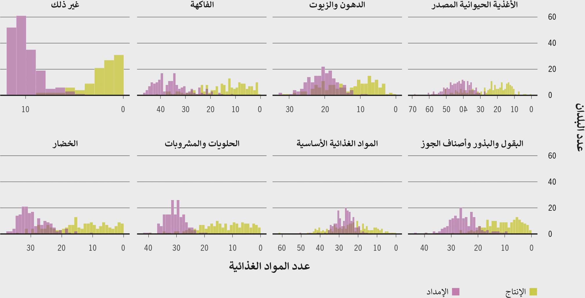 وتنطبق أنماط مماثلة عند تصنيف المواد الغذائية بحسب فئات الأغذية (الشكل 3-3). وتبيّن في جميع فئات الأغذية أن تنوع الأغذية المتاحة للاستهلاك أعلى بكثير من تنوع الإنتاج. وفي عام 2020، أسفرت التجارة في معظم فئات الأغذية عن قيام متوسط البلدان بإمداد ما يقرب من ضعف كمية الأغذية المختلفة التي تنتجها.