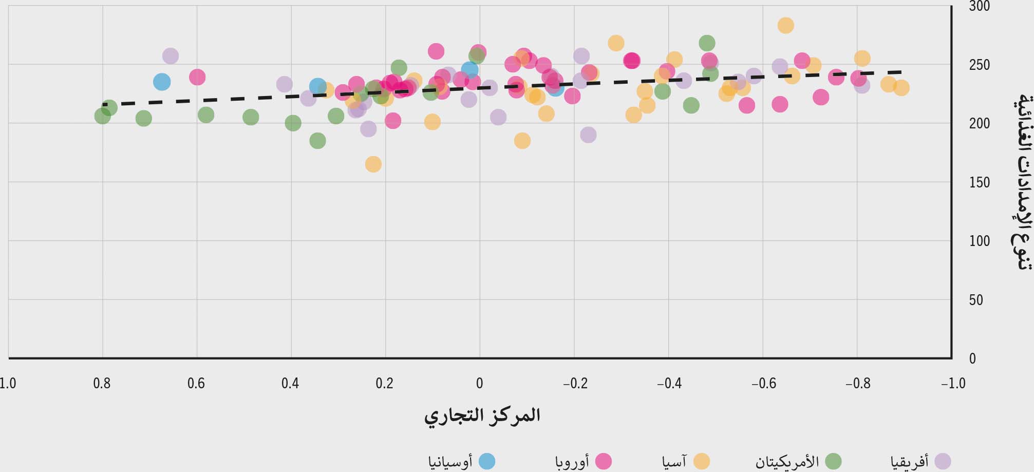 وأشارت الدراسة التي أُجريت لهذا التقرير إلى وجود ارتباط ضعيف بين المركز التجاري الصافي لبلد معين وتنوع إمداداته الغذائية (الشكل 3-5). ويمكن أن تُسجَّل لدى الجهات المصدّرة الصافية الرئيسية للأغذية مستويات أقل قليلًا من تنوع الإمدادات الغذائية مقارنة بالجهات المستوردة الصافية للأغذية.