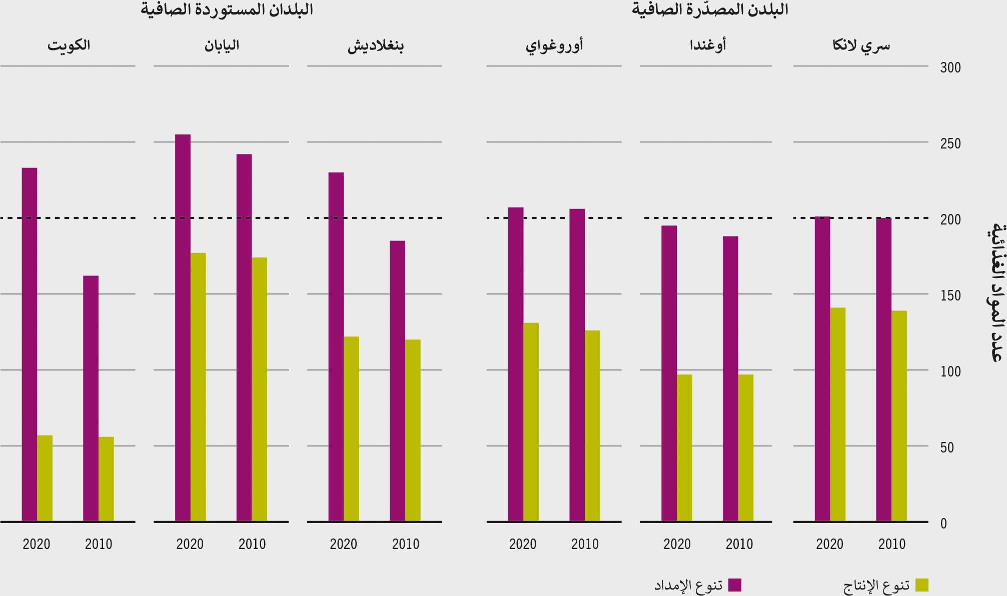 الشكل 3-6تنوع إنتاج الأغذية وإمداداتها في بلدان مختارة، 2010 و2020