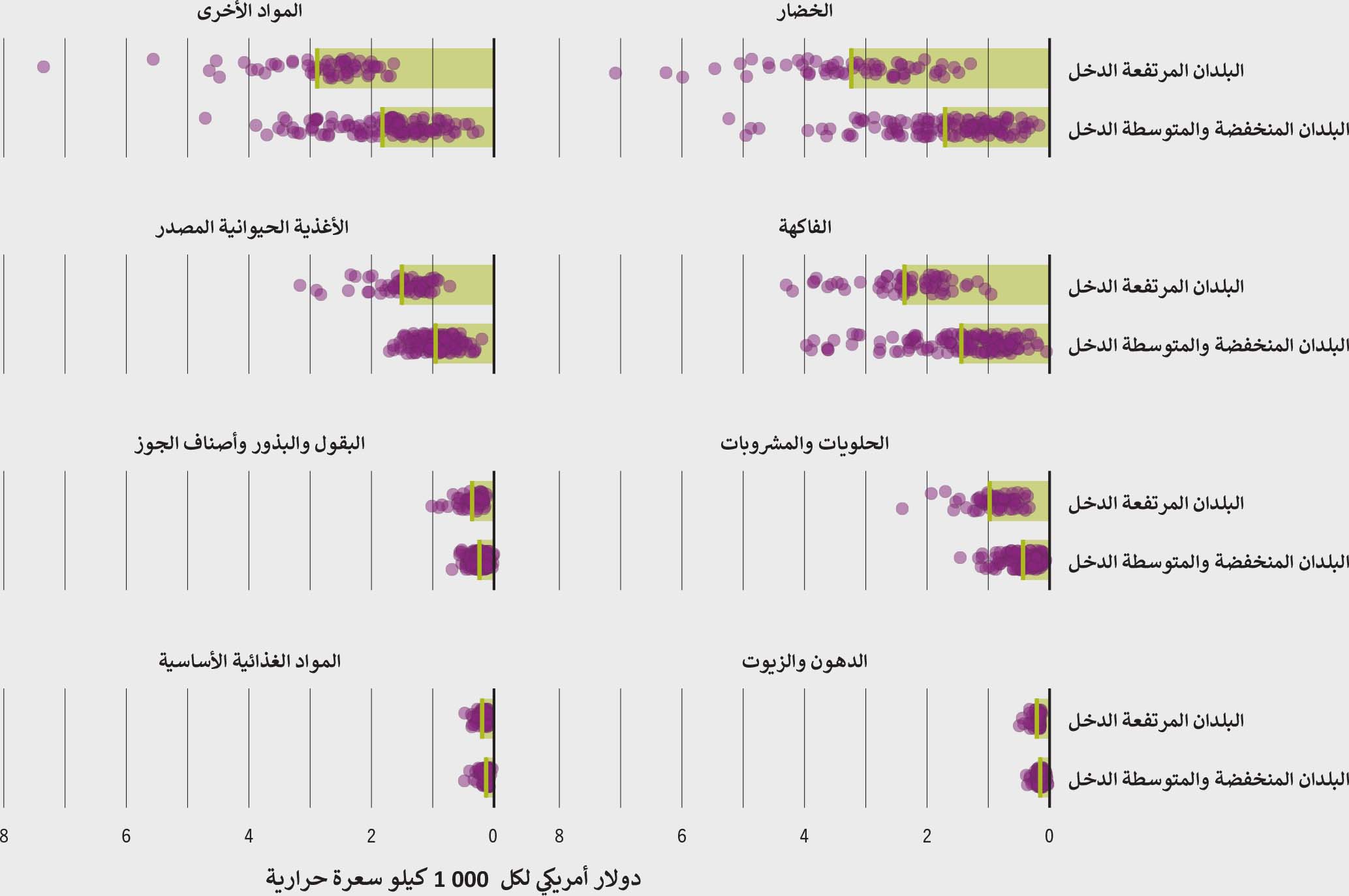 ويمكن لدراسة مستويات أسعار الاستيراد المتوسطة لكل سعر حراري لفئات الأغذية المختلفة المتجَر بها في جميع أنحاء العالم أن تساعد عمومًا في فهم كيفية تأثر نتائج التغذية بالأسعار النسبية للأغذية. وعلى سبيل المثال، تكون الأسعار أعلى في المتوسط بالنسبة إلى الخضار، وتليها الفاكهة،ت بغض النظر عن مستوى دخل البلد (الشكل 3-10؛ انظر الإطار 2-1 لتعريف البيانات والإطار 3-2 للحصول على معلومات عن تحويلات البيانات والقيود).