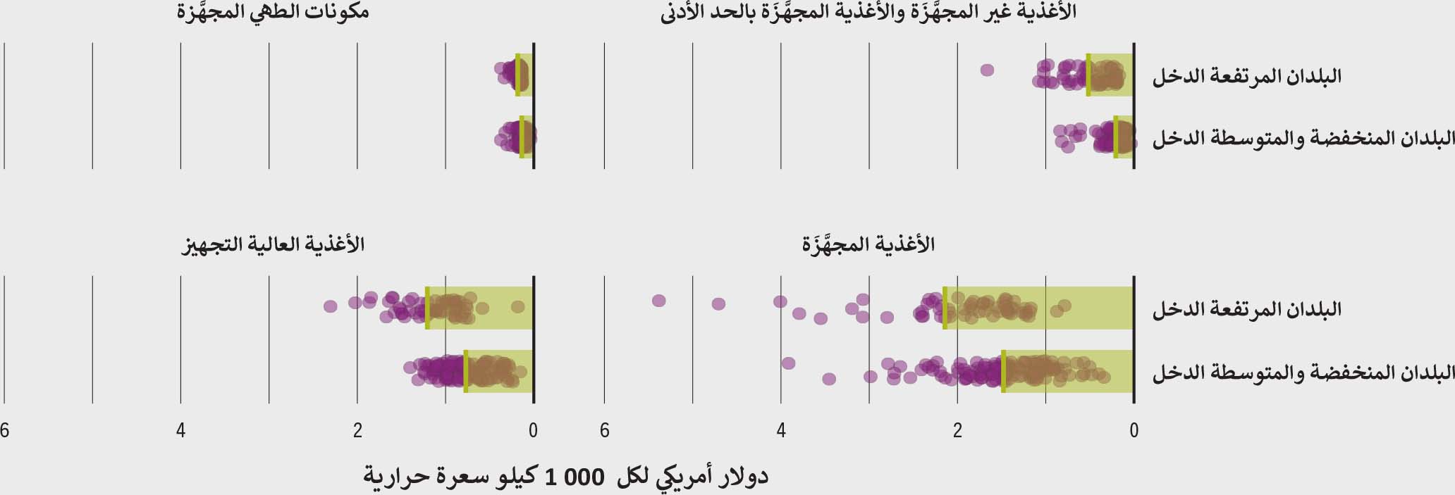 ويُظهر تحليل متوسط أسعار الواردات لكل سعرة حرارية وفقًا لمستوى تجهيز الأغذية أن الأغذية المجهَّزة، تليها الأغذية العالية التجهيز، هي الأغذية الأغلى ثمنًا في جميع مستويات الدخل في البلدان. أما الأغذية غير المجهَّزَة والأغذية المجهَّزَة بالحد الأدنى ومكونات الطهي المجهَّزة فهي أرخص ثمنًا نسبيًا (الشكل 3-11).خ