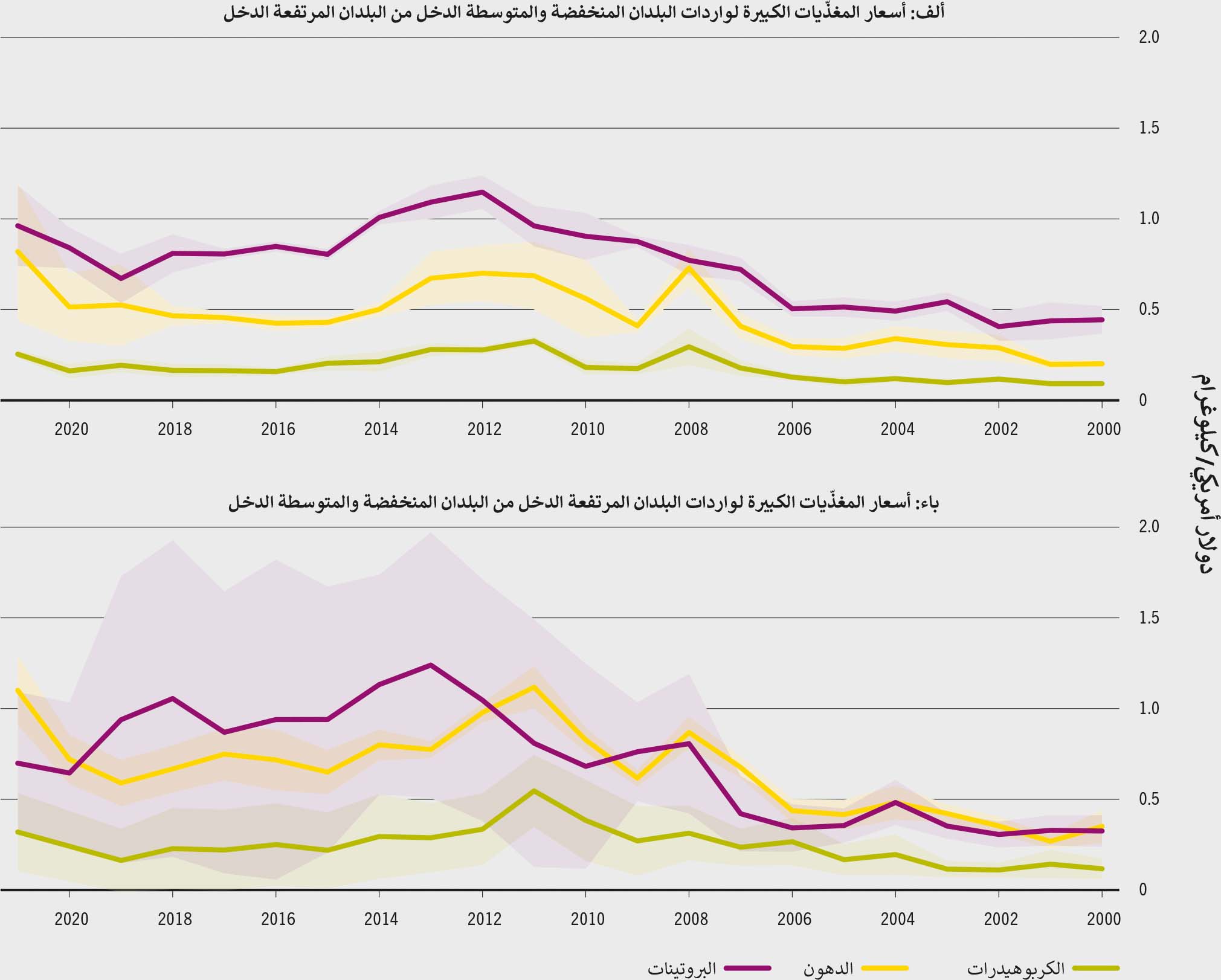 الشكل 3-12أسعار المغذيات الكبيرة بحسب التجارة بين مجموعات دخل البلدان، 2021-2000