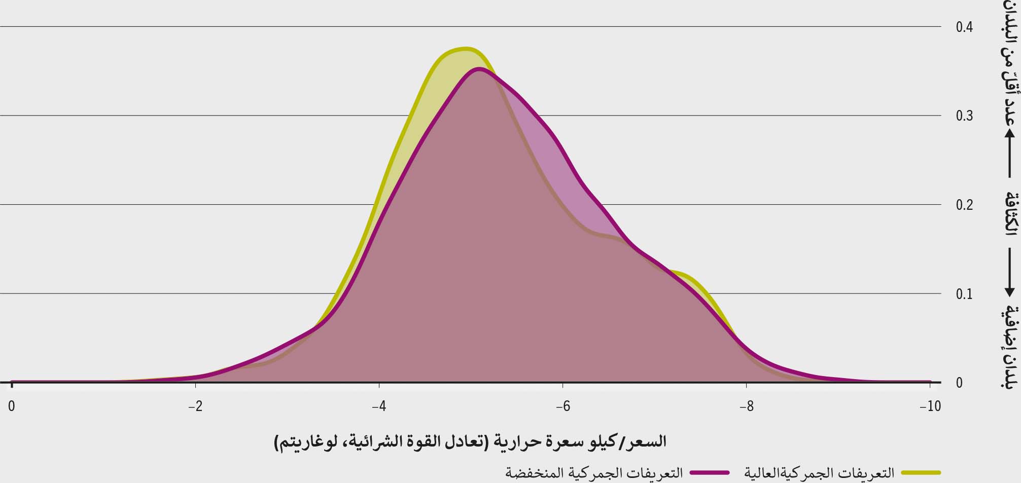 ويُبيّن تحليل أُجري لهذا التقرير أن التعريفات الجمركية المنخفضة على الواردات ترتبط عمومًا على المستوى العالمي بانخفاض أسعار التجزئة للمواد الغذائية المقاسة على أساس السعرات الحرارية ومعدّلة بمقتضى القوة الشرائية (الشكل 3-13).147 ويوضح تصور عمليات توزيع أسعار 547 سلعة غذائية في 170 بلدًا، والمستمدة من برنامج المقارنات الدولية التابع للبنك الدولي، أن الأغذية تميل إلى أن تكون أعلى كلفة في البلدان التي تفرض مستوى مرتفعًا من التعريفات الجمركية على المنتجات الزراعية الأولية مقارنة بالبلدان التي تفرض تعريفات جمركية أدنى نسبيًا.ض ،غ