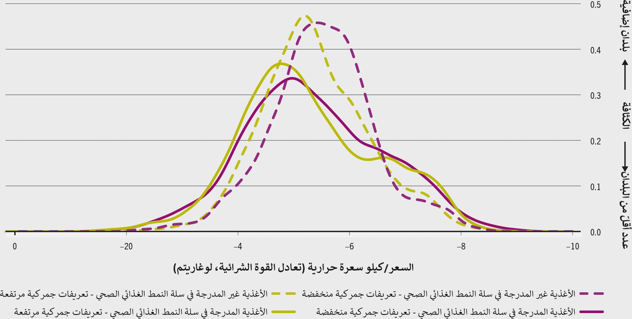 مع أن متوسط تأثير الحواجز التجارية على أسعار الأغذية واضح، هناك شواغل إزاء إمكانية أن يؤدي الانفتاح التجاري إلى انخفاض غير متناسب في أسعار الأغذية الأقل ملاءمة للأنماط الغذائية الصحية، ما يتسبب في استبدال الأغذية المحلية ذات النوعية الأعلى مع ترتب آثار سلبية على التغذية.148،149،150 وقام تحليل أُجري لهذا التقرير، يصنف الأغذية بما يتماشى مع مؤشر كلفة النمط الغذائي الصحي وقابلية تحمّلها،151 بتقييم ما إذا كانت الأسعار المنخفضة الملحوظة في البلدان التي تطبّق تعريفات جمركية أدنى على الواردات مدفوعة بمستويات أسعار منخفضة للأغذية الغنية جدًا بالطاقة والقيمة الغذائية الدنيا.152