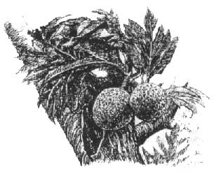Breadfruit (Artocarpus altilis) The breadfruit tree is a good example of a multipurpose species. Several different cultivated varieties are consumed, and in some places even the seeds are roasted and eaten. Apart from providing food, the trunk provides excellent raw material for canoes, paddles and traditional slitgongs. The latex sap was formerly used for caulking seams and for trapping birds, and healers still use it to treat fractures, sprains and rheumatism. The roots are also reputed to have medicinal value and the stamens are burned as a mosquito repellent. |