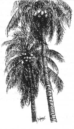 Coconut (Cocos nucifera) The coconut palm deserves special note, given the large area of Vanuatu devoted to coconut plantations and its multiple uses. Apart from copra, which is a principal cash crop for export, coconuts provide food and beverage for human consumption. The edible heart of the young sprout is particularly relished by children. The nut is also fed to pigs, dogs and chickens. The coconut shell is used to make utensils, ornaments and charcoal. Husk fibres are used in making a strong cord. The leaves are used to weave rough mats, baskets and brooms, and to make thatch. The secondary ribs of the leaves are also used for making skewers and brooms. Coconut oil has a variety of uses. |