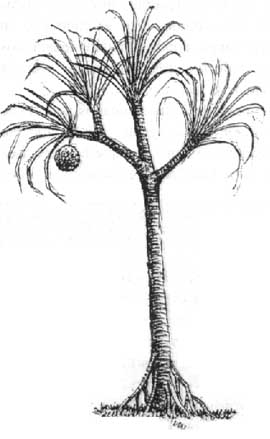 Pandanus (Pandanus tectorius) Pandanus (screw pine) is historically one of the more important species throughout Polynesia and Melanesia. The English common name refers to the spirally arranged leaves and evergreen foliage. The soft, brightly coloured pulp of the fresh fruit can be eaten raw or cooked. Although infrequently used for its food value in present-day Vanuatu, it has many other important uses. The leaves provide a source of thatch for houses and for making mats and baskets. In Vanuatu, pandanus leaves are usually used for finer mats, those for presentation, land exchange or burial rites. The common mat put on the floor for daily use is generally made from coconut leaves. The sections of the pandanus fruit are used to make fragrant necklaces. The male flowers are used to scent coconut oil and sometimes the fruit and flowers are just left in a room to provide a pleasant smell. In the past, grass skirts were produced from pandanus leaves. |