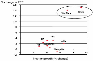 Developments in South Asia stand in sharp contrast to much lower consumption levels in Southeast Asia, where average per capita consumption levels, at 32 kg per capita, are one-third the levels in South Asia. While India and Pakistan have the highest per capita consumption levels in Asia at 80 kg and 180 kg, respectively, most of the strongest consumption gains in percentage terms have been due to rapid gains in non-traditional milk-consuming countries, such as China and Viet Nam (Figure 1). Consumption gains have been largest in countries with low per capita consumption estimates. Estimates of per capita consumption range from 2–5 kg per capita in Cambodia and Lao People’s Democratic Republic to 11–15 kg per capita in Philippines and Viet Nam and to 40–55 kg per capita in Korea, Malaysia and Thailand.