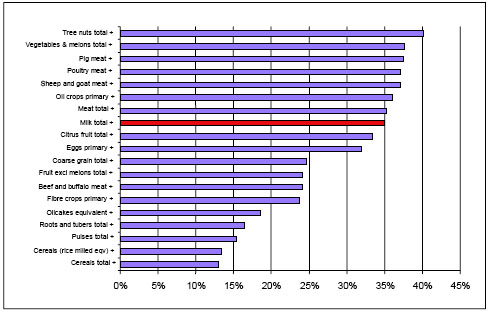 This has largely benefited smallholder dairy producers in a region where milk production is an integral part of the small-farm economy in many countries, providing cash, capital assets and nutritional benefits to tens of millions of households. Spread across the largest, most geographically diverse region in the world, aggregate growth in the Asian milk output over the past decade has been exceeded only by that of certain meats and vegetable crops (Figure 2). It also has likely served as a catalyst to overall rural development; FAO estimates that every 10–20 litres of milk marketed in traditional markets has created one non-farm job. Of concern, however, is the much slower growth in grain and fodder production (Figure 2). While many of the production systems in which animals are now located are low input–output systems, characterized by feed produced from local crops, increasingly the emergence of more commercial operations will require access to better quality feed.