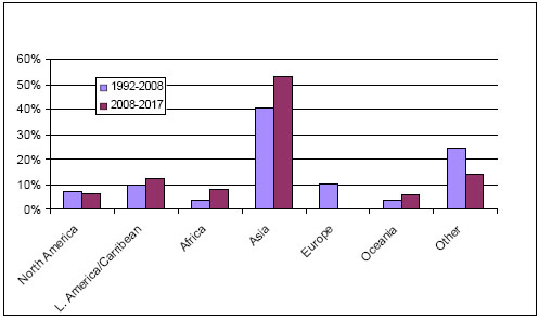 Similar to previous trends, the Organisation for Economic Co-operation and Development (OECD) and the Food and Agriculture Organization of the United Nations (FAO) project that the strongest gains in dairy production and consumption over the coming decade will take place in Asia1. Increasing incomes and a continuation in changing consumption patterns are expected to translate into a nearly 120 million tonnes increase in world milk production, up 20 percent to 803 million tonnes by 2017. Over half of these output gains, or 63 million tonnes, will be produced in Asia, particularly China and India, two countries which are expected to account for a respective 16 and 20 percent of the global increase.