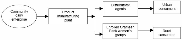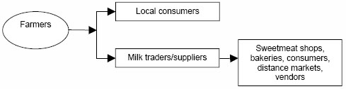 Private dairies, some owned by non-government organizations (NGOs), such as the Bangladesh Rural Advancement Committee (BRAC), usually operate through milk supplier/middlemen (known as ghoshes or dudhwalas) in place of rural groups or cooperatives (Figure 3). They collect milk for a specific dairy, however, smallholders involved in the system do not receive any value-added benefit – only the basic price for their milk.