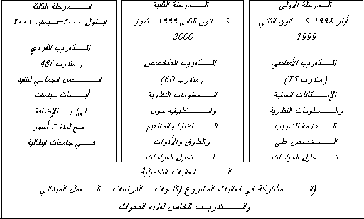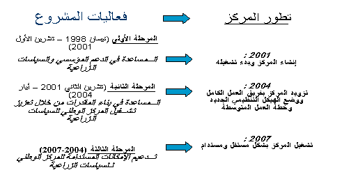 المرحلة 1 المساعدة في التعزيز المؤسسي والسياسات الزراعية – في الفترة نيسان 1998-تشرين الأول 2001 والتي وضعت حجر الأساس لإنشاء المركز الوطني للسياسات الزراعية وذلك استجابة للحاجات الملحة في مجال تحليل السياسات الزراعية بالاعتماد على الخبرات الدولية بشكل رئيسي . المرحلة 2 المساعدة في بناء المقدرات من خلال دعم تشغيل المركز الوطني للسياسات الزراعية – في الفترة تشرين الثاني 2001-أيار 2004 والتي تركز على تعزيز الإمكانات التشغيلية للمركز من خلال دعم الإمكانات المحلية بتوفير الخبرات الدولية . المرحلة 3 (2004-2007) التي ستوفر الدعم الدولي للتدعيم المستدام لإمكانات المركز ليصبح قادراً على معالجة تحليل السياسات الزراعية في سورية . وقد تضمنت كل مرحلة من مراحل المشروع أربعة مكونات : التطوير المؤسسي – تحليل السياسات الزراعية – التجريب – المعلومات الإحصائية . وقد ركز مكون التطوير المؤسسي على توفير البدائل لتعزيز الإمكانات المؤسسية لدى وزارة الزراعة والإصلاح الزراعي في مجال السياسات الزراعية وبشكل أكثر تحديداً لتطوير إمكانات المركز في تنفيذ مهامه . أما مكون تحليل السياسات الزراعية فيدعم الإمكانات الفنية لتنفيذ المراجعة الشاملة وتحليل السياسات الزراعية والاستراتيجيات والبرامج . وقد ساعد مكون التدريب على إنشاء كادر محللي السياسات اللازم للمركز والجهات الأخرى مع التركيز على تعزيز إمكانات فريق العمل في المركز على العمل المستقل كمحللي سياسات . |