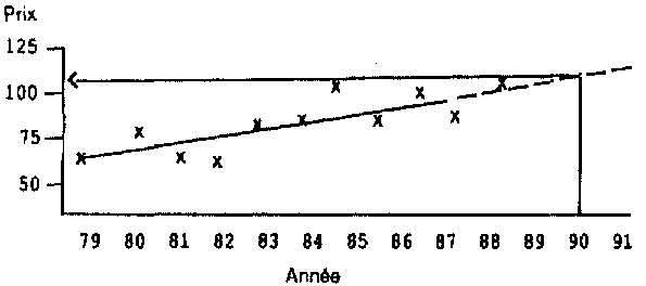 Enfin, l'agent de vulgarisation devra calculer le prix futur probable. Le plus simple est de dessiner un graphique sur lequel on porte les deux prix moyens. On prolonge la ligne joignant les deux points. On peut alors lire les projections.
