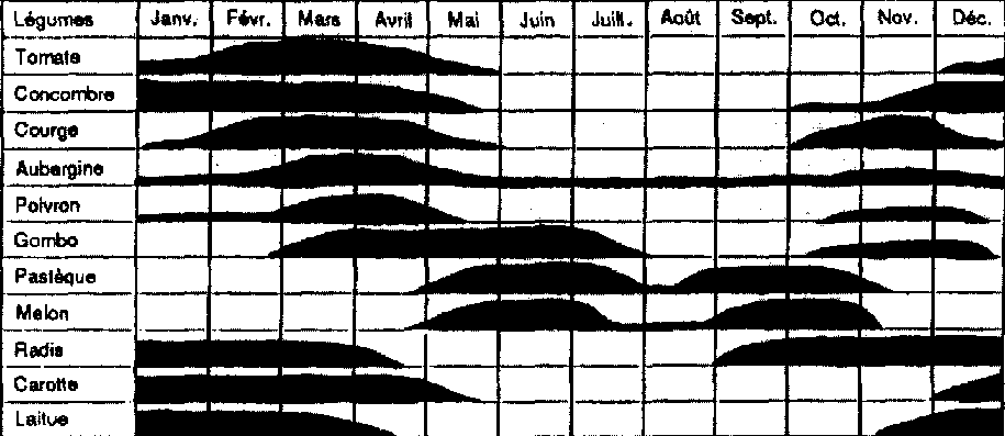 Les courbes de l'offre saisonnière permettent d'identifier les périodes de pénurie et donc des débouchés potentiels (voir Graphique 5.Echelonnement do la saison des léqumes au Proche-Orient).