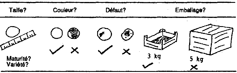 A l'opposé, on peut citer l'exemple d'un marchand de tomates dans un marché hebdomadaire de village en Egypte. I1 achète 20 caisses de 18 kg de tomates non classées au marché de gros d'Ismailia. Ensuite, il les classe luimême selon la qualité mais non la maturité. Les ménagères choisissent elles-mêmes ce dont elles ont besoin: les unes préfèrent des tomates très mûres à cuire, d'autres des tomates plus fermes pour faire la salade, d'autres un peu moins mûres pour les conserver quelques jours. Il est évident que le marchand n'aurait aucun intérêt à payer plus cher des tomates classées. Il est préférable pour lui de faire lui-même un classement sommaire. Même si les tomates étaient classées, il devrait les trier de nouveau pour éliminer celles qui se sont abîmées pendant le transport. De toute façon, ses clientes préfèrent pouvoir choisir des tomates plus ou moins mûres.