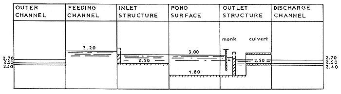 Outlet structures : should be monk sluice type (see report drawing) in order to allow dirty bottom water and detritus to be flushed, but culvert sill level may be 2.50 m.