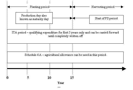 of latex does not qualify for any tax exemption. For plantations cultivated with cash crops, separate production days for the trees and the cash crops are considered, provided the cash crops cultivated are “promoted activities” under the Promotion of Investments Act, 1986. The pioneer status for the cash crops would be the 70 or 85 percent exemption from the statutory income as the case may be. Source: Woon and Lee (2001) |