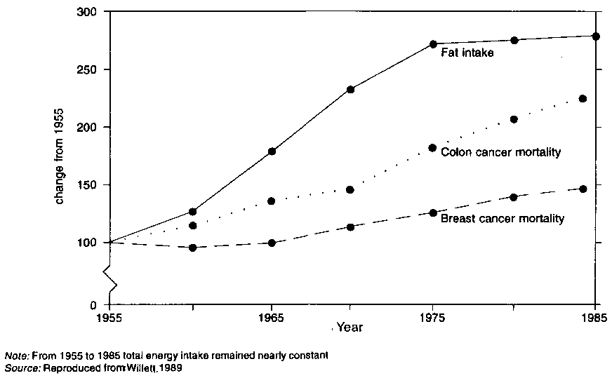 Epidemiological evidence. Cancer of the breast and colon account for a large proportion of the total cancer in Western populations. Both show a strong positive correlation with fat consumption in inter-country studies. Time trends and migrant studies are consistent with these patterns. However, in Japan, colon cancer has increased more rapidly than breast cancer as fat intake has risen (Figure 11.1). Migrants also show a more rapid increase in colon cancer (Berg, 1975) than breast cancer.