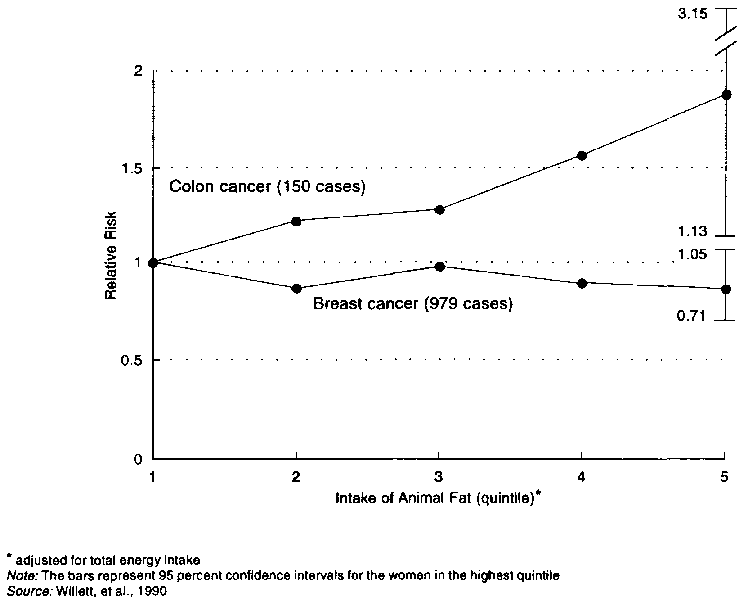 In case-control studies, dietary fat appears to be more consistently associated with colon cancer than breast cancer (Carroll, 1994; Willett, 1989), which would be expected because of the longer latent period for breast cancer. Although some studies show a positive association of breast cancer with dietary fat and others do not, a combined analysis of 12 case-controlled studies indicated a statistically significant, positive association with saturated fat intake and breast cancer in post-menopausal women (Howe, 1990). Case-control studies have generally shown a positive relationship between fat intake and colorectal cancer (Whittemore et al., 1990).