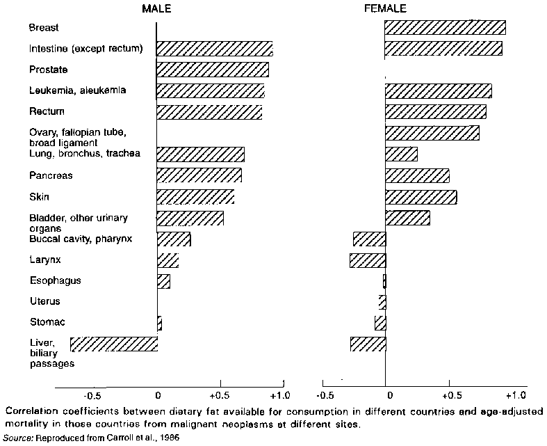 There have been a limited number of investigations of the relationship between dietary fat and cancer at the following sites: pancreas, prostate, skin, lung, ovary, bladder, oral cavity, non-Hodgkin's lymphoma and leukaemia. The inter-country correlations show prostate cancer to be strongly correlated with fat while the relationship is weaker for other sites. In Figure 11.3, the correlation coefficients between the availability of dietary fat and the age-adjusted mortality rates for malignant neoplasms in different countries are illustrated.