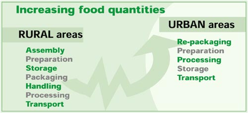 Once produced, food products need to be assembled, prepared, packaged, stored, processed and transported to urban areas (see Figure 1.1). These functions require skills; assembly markets in rural and periurban areas; handling, packaging, storage, processing and transport facilities; credit to transporters and traders; market information and extension for production and marketing decisions; appropriately enforced legislation and regulations. All such infrastructure, facilities and services need to be efficiently provided and managed. Otherwise, the various costs relating to each of the above elements will be higher than necessary. Post-harvest food losses can be as high as 35 percent in perishable food products.