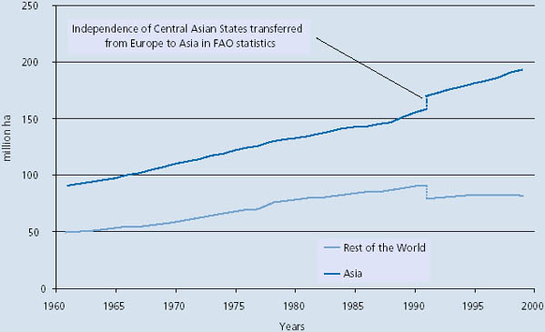 Evolution of irrigation in Asia[3] vs rest of the World (source: FAO)