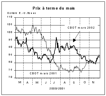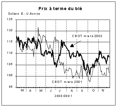 Les cours mondiaux de la plupart des céréales ont subi peu de variations depuis le précédent rapport. En novembre, le blé EU n°2 (HRW, fob) était coté en moyenne à 128 dollars É.-U. la tonne, en légère augmentation depuis septembre mais à environ 2 dollars É.-U. de moins qu'en novembre 2000. Au cours des mois récents, les prix du blé sont tombés au-dessous des niveaux de l'année dernière malgré une baisse de la production totale de blé cette année. Une explication probable est l'existence de quantités exportables relativement importantes dans plusieurs pays gros producteurs de blé et l'absence de toute amélioration significative de la demande d'importation mondiale. Les disponibilités accrues de blé de basse qualité de plusieurs origines ont également contribué à la faiblesse générale des prix.
