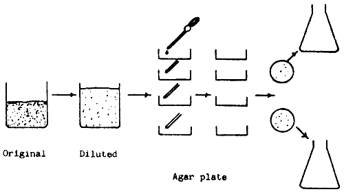 This is a very simple and very useful isolation method. Put a drop of the plankton water that was collected by plankton net or other means into each of several small Erlenmeyer flasks (50 to 100 ml) or test tubes. It may be necessary to dilute the plankton water to lower the concentration of organisms and reducing the number and kinds of organisms in a drop. The flask or test tube should contain a variety of media such as natural seawater, enriched water or artificial media of different salinities. Then incubate under different conditions of temperature, light intensities, illumination time, etc. After a few days under these conditions, a dominant species will appear in each flask. When these happens, repeat the process by transferring a drop from each flask to a new flask containing the same media and then incubate this new flask under the same conditions. This second isolation will probably produce monospecific culture.