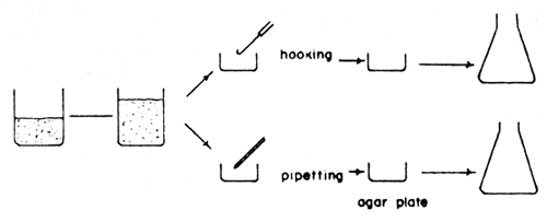For this method, pour the plankton water, dilute if necessary into a Petri dish. Then pick up the desired species with a fine hook or a capillary pipette under a microscope, preferably a binocular microscope. Transfer the organism into an agar plate and examine it again under the microscope to be sure only one species is present. If only one species is present, it may be incubated on this agar plate or transferred to liquid medium in a flask. If another isolation is necessary to achieve a monospecific culture, either the repeated subculture method or agar plate method may be used or the hooking and pipetting procedure may be repeated.