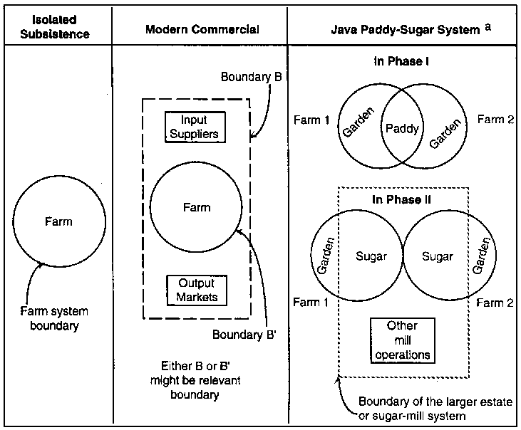 This third situation in some of its variations can be quite complex. For example, the farms of the villages around Karanganyar in the Solo Valley of Java commonly consist of some area of household garden devoted to fruit trees and bamboo plus a larger area of fields (Prabowo and McConnell 1993). They are nominally 'owned' (in the Javanese sense, or held in trust in perpetuity) by the operating families who in fact do exercise full control over the garden or 'pekarangan' parts of their farms. In three years out of four the field area of a farm will usually be under paddy, grown either by the farmer himself or herself or more typically as a quasi-cooperative/mutual-help undertaking ('gotong royong') by the farmer and his or her neighbours. Thus in this first phase the boundary around each farm system encompasses its household garden and some area of paddy shared with other farm households. But in the fourth year the farm paddy fields, together with one fourth of all other village fields (which lie within the command area of a publicly owned sugar mill) are pooled, put under sugarcane, and the farmer becomes both a labourer (on his or her own land) for the mill and a landlord (receiving rent from the mill). In short, the boundary of this farm system is fluid over time: it always encompasses the pekarangan (household garden) lands; it sometimes encompasses the rice field and other farm households which participate in the rice phase; and it sometimes exists only as one part of the boundary of a much larger sugar-estate system. The situation is depicted diagrammatically in the righthand side of Figure 3.1. The lefthand side of Figure 3.1 refers to an isolated subsistence farm system. The central part of Figure 3.1 depicts a commercial system in which the alternatives are to define the system as consisting only of the farm (implying boundary B') or as also including input suppliers and output markets (implying boundary B). The contrast in complexity between these three examples of farm-system boundaries is obvious.