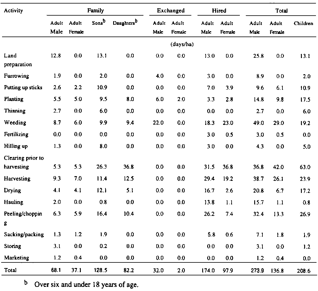 Obviously family labour is a very important resource on small farms. In some areas of high population pressure, small farms might support nucleus and extended families of up to ten or more persons, all of whom except the very young and very old can supply some labour. But the actual available supply is often difficult to measure because family labour has quantity, quality, time and often custom dimensions. Difficulty in measurement arises from the fact that the different family age/sex population classes often generate different amounts of labour service (e.g., as differentially provided by young men, women, older children and grandparents), and that some farm operations/tasks are labour-type specific while others can use any class of labour. The custom dimension complicates things further by insisting that certain tasks which could well be done by men (or women) must in fact be done by women (or men) (van Herpen and Ashby 1991).