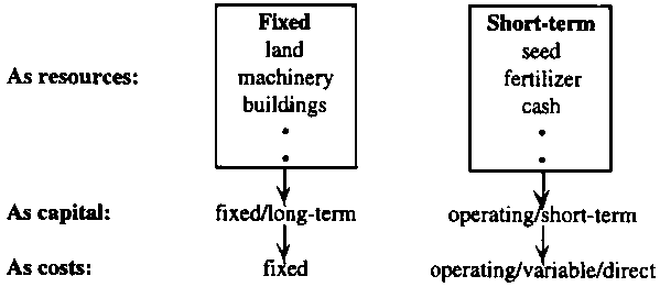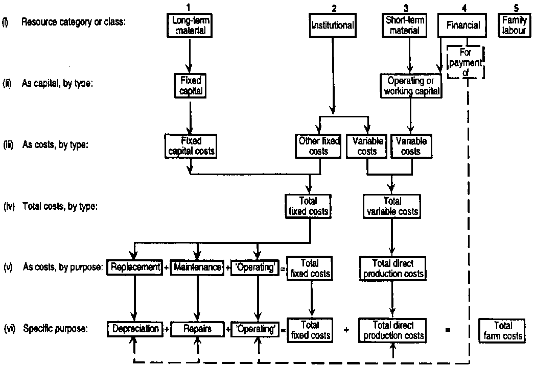 In Figure 3.3, starting with the first resource category of long-term fixed material resources in column 1, row (ii) shows this as becoming farm fixed capital. In row (iii) this type of capital gives rise to fixed capital costs. Then, going to row (iv), this group of fixed costs forms one component of total farm fixed costs (the other component of farm fixed costs being those fixed costs which might arise from institutional resources as discussed below).