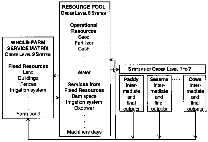 Any initial stock of both fixed and short-term resources must sooner or later be replenished from output of the productive enterprises/activities, either as materials purchased with income from the activities or as resources/intermediate products generated by these activities, e.g., oxen produced as a by-product of the dairy activity. These resource return flows are indicated in Figure 3.2 as flowing both to the resource pool and to maintain the stock of fixed resources or capital in the whole-farm service matrix.