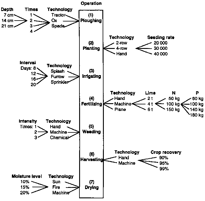 The operations of Table 5.1 are listed again in Figure 5.1. This also shows, for each operation, the alternative technologies that might be employed in performing it and a range of input intensity levels at which each technology might be implemented. For example, the 'ploughing' operation could be done by tractor, by oxen or by spade; and whichever ploughing technology is chosen could be applied one, two, three or four times: further, whichever of these possible combinations is used, it could be applied to cultivate to a depth of 7, 14 or 21 centimetres. Alternative possible technologies and alternative possible technology intensities or input levels are also shown for the other of the seven production operations.