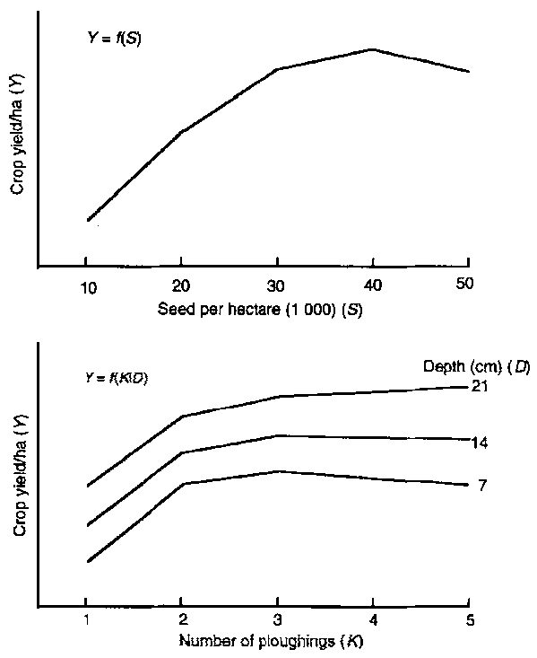 Figure 5.2 illustrates the concept of production functions. In the top figure, crop yield per ha (for some particular set of climatic, soil and husbandry conditions) is graphed as a function of the single input-variable seeding rate over the range from 10 000 to 50 000 seeds per ha. This depicts the response or production function Y = f(S). In the lower figure, crop yield per ha (again for some particular set of climatic, soil and husbandry conditions - including seeding rate but excluding ploughing frequency and depth) is shown as a function of the two variable inputs depth (7, 14 or 21 cm) and number of ploughings (1, 2, 3, 4 or 5). This depicts the production function Y = f(D, K) by the set of three single-variable input-output graphs Y = f(K/D) (for D respectively equal to 7, 14 or 21) where D and K respectively denote depth and number of ploughings and the symbolism K/D indicates that K is variable while D is fixed at some specified level (Dillon and Anderson 1990, Ch. 2).