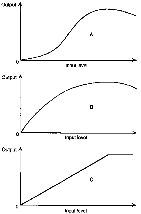 (iii) Mechanical processes do not exist as part of a plant/animal biological system, but act as physical/mechanical support to such systems. Some of them can be operated at varying intensity levels, such as the delivery of feed to a herd of cows by a conveyor belt driven at varying speed. Here there might be some non-linear relationship between, say, fuel consumption and amount of feed conveyed by the belt, and the relationship would appear as in Figure 5.3 B. In consequence, determination of optimal belt speed would be economically relevant. Many types of mechanically powered equipment - tractors, trucks, stationary motors - have such an optimal operating rate. But with others the relationship between fuel input/speed and work output is linear over some specified range (Part C of Figure 5.3); if the machine is operated beyond this range, it might simply disintegrate.