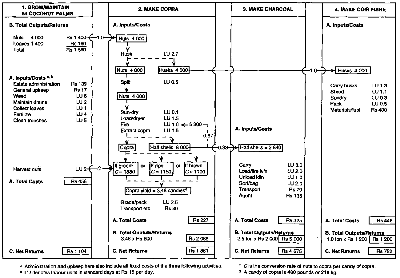 Operating costs are the costs of actually operating a capital item: e.g., Rs 800 for water-pump fuel, Rs 200 of feed and veterinary expenses for the oxen. In Table 5.5 the tractor would, of course, also incur fuel and oil operating costs but in a typical farm situation it would be fairly easy to charge these against the separate specific activities (paddy, cotton etc.) which actually consume this fuel or incur such operating costs, rather than against the farm as a whole. Often, however, some capital operating costs will be incurred in nonspecific farm work, in which case they should be included in column (6). This was discussed in Section 3.3.6 in relation to Figure 3.3.