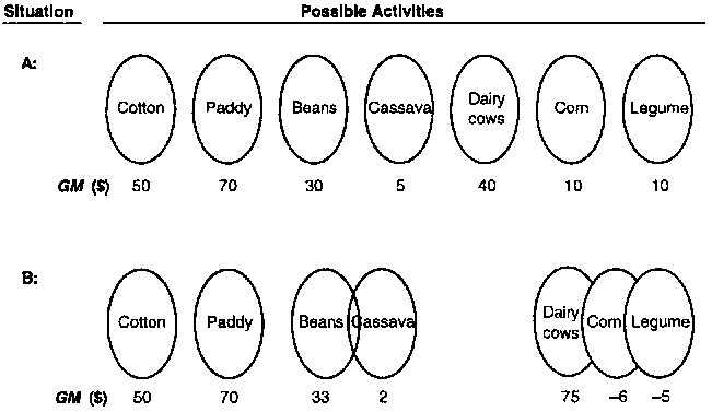 The matter of structural dependence/independence between activities is illustrated schematically in Figure 9.1. Situation A shows a set of independent activity subsystems arranged for planning (as in Section A of Table 9.2 below). Since each activity carries a positive GM and is independent of the others, application of either AB or SP or LP methods is possible. In planning situation B of Figure 9.1, some activity dependence is depicted: here the cassava is both sold and used as live supports for the beans, which are thus dependent on the cassava; and the legume crop is now not sold but used to provide fertility for the corn crop which is in turn used to provide a grain resource for the dairy cows. In contrast to situation A, in situation B, according to the GM activity selection criterion using AB or SP methods, neither legumes nor corn would be considered for inclusion in the plan; and beans also would be unlikely to come into the plan because this activity, though itself carrying a high GM, first requires production of some amount of low-GM cassava. In summary, situation B is readily handled by LP, but not by AB or SP unless the beans + cassava and the cows + corn + legume activities are redefined as new composite activities. Essentially this would 'tie' a negative or low-value GM activity to a high GM one, thus permitting the former to be considered for plan inclusion. This is possible up to a point but is limited by the amount of clerical work involved and the fact that it partly predetermines the planning outcome.