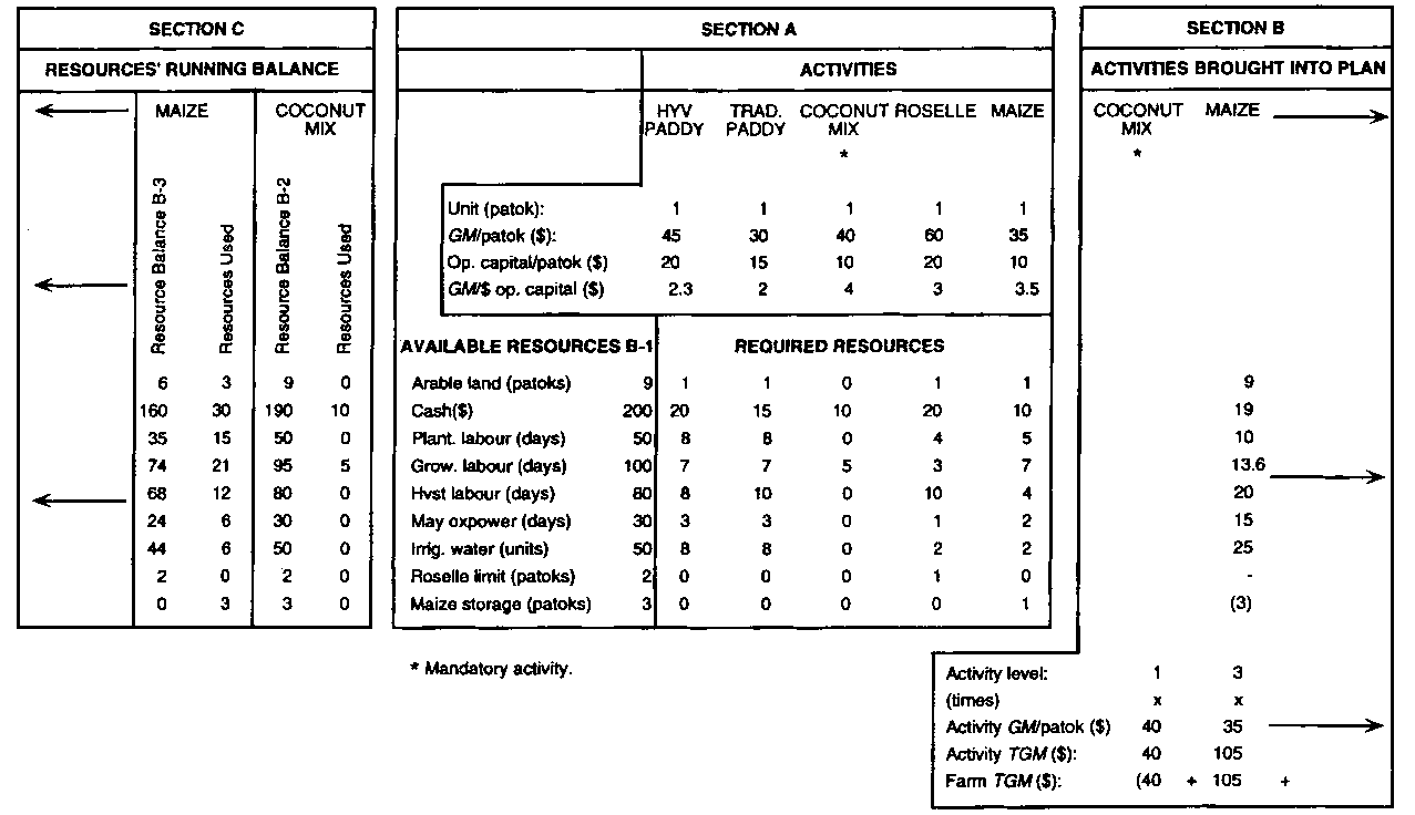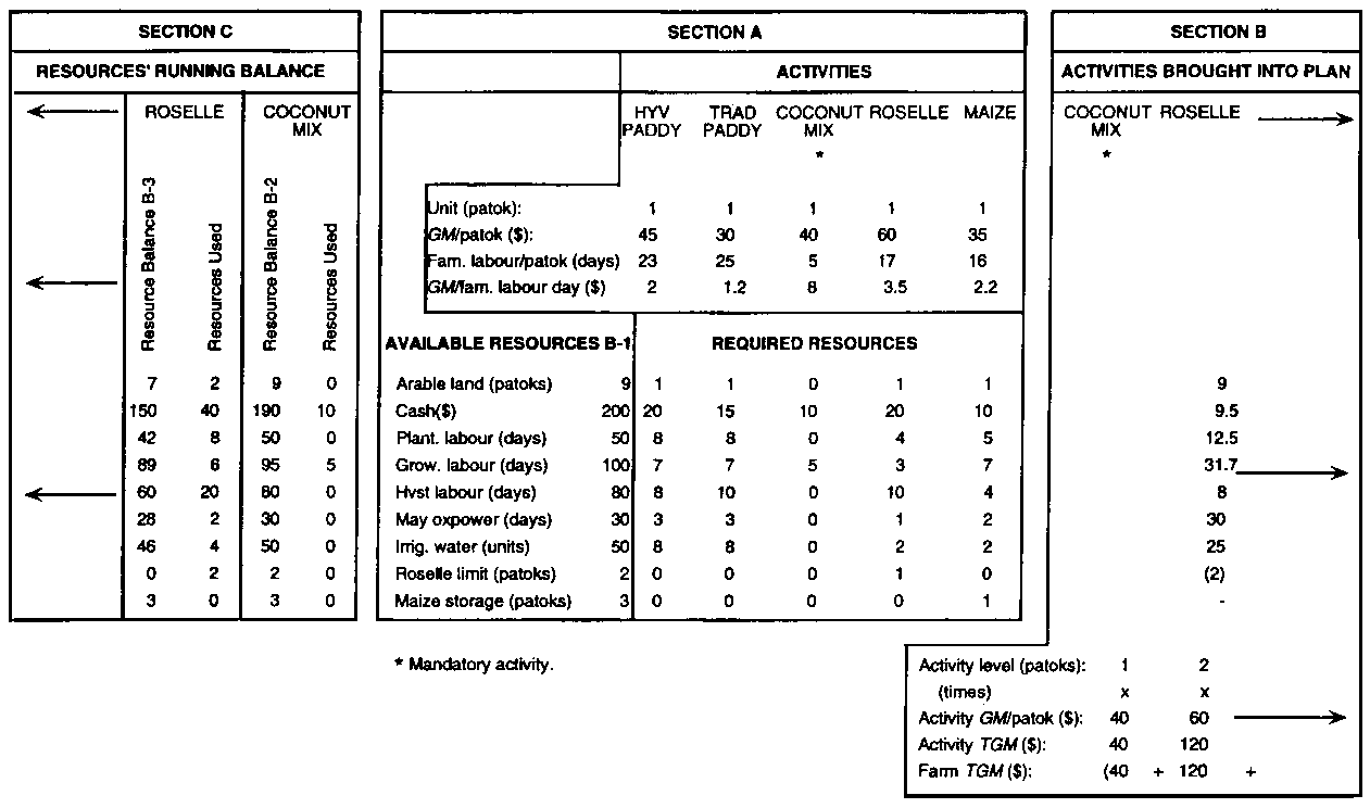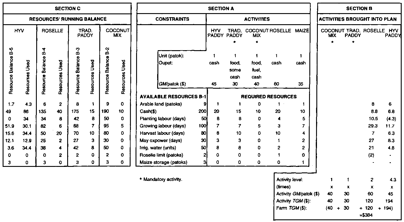 There are two ways of handling mandatory subsistence-oriented activities. If appropriate, the requirements of such an activity might simply be subtracted from the initial stock of resources, then the planning analysis is directed at finding the best mix of optional activities for the remaining resources. This common-sense approach is adequate if the mandatory activity is predetermined - if, e.g., the family must have 0.25 ha of paddy; exactly or at least 0.1 ha of beans; at least one patok of sesame etc.
