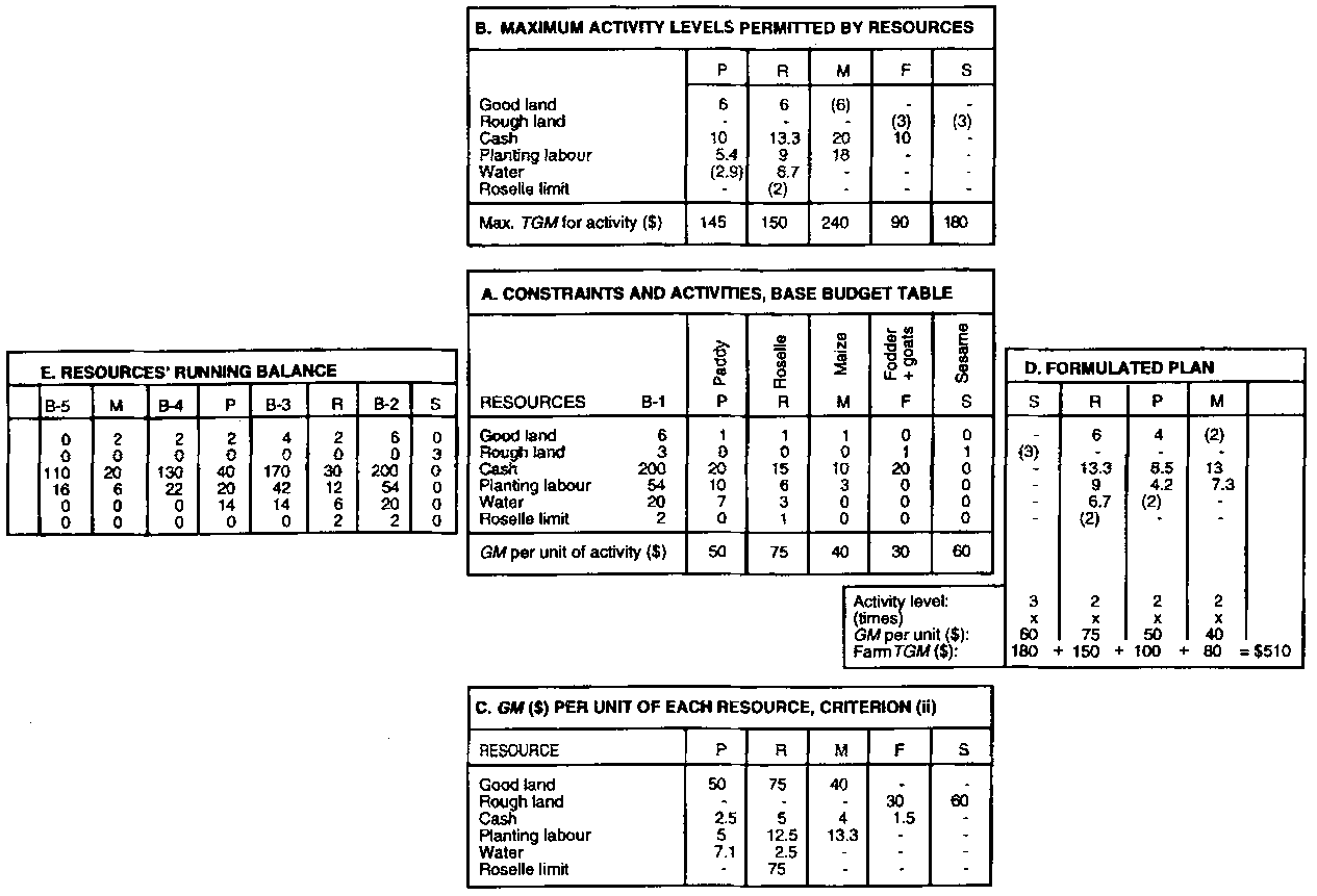 The planning objective remains the same, i.e., to maximize farm cash TGM, but here it is subject to the technical dependence conditions that: (a) high-profit maize needs soil fertility (but there is not yet a 'supply' of this in the resource pool B); (b) such fertility could be provided by cows, but cows need feed (and there is initially no feed in B); (c) such feed could be obtained from legumes and/or maize but, from above, maize is not yet possible. Therefore, the only way to achieve the TGM objective is to grow some legume (at a negative GM) for the cows; then obtain fertility from the cows for the maize which, incidentally, would provide yet more feed for the cows to produce more fertility for the maize etc. until some critical resource (land, water, labour) is exhausted.