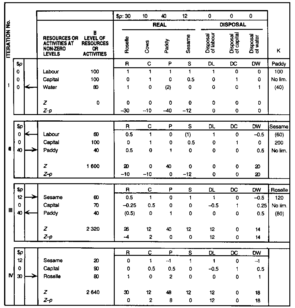 Table 9.12 is largely self-explanatory; only two points might be noted. First, on this example farm the disposal or non-use of irrigation water carries a cost of $10. This is based on the fact that, if the farmer does not use her or his full quota of water in any season, it will be reduced by this amount in the next season and she or he must then buy it back or pay a fine of $10 for each unused unit. The other disposal activities bear no such cost. Second, for each minimum requirement specified in the B section, there will be a disposal activity which carries a zero price, and an artificial activity which carries a very high negative price of -M. Finally, given this base table specified so as to accommodate mandatory activities, the operating steps to determine the LP-based optimal farm plan are the same as in previous examples: the Z and Z - p rows are obtained and the analysis proceeds as in Table 9.9. While such analysis is clearly tedious (and prone to error) if done by hand, it is easily carried out on a personal computer using available LP software such as, e.g., GAMS (Brooke, Kendrick and Meeraus 1992) or What'sBest!ä (Lindo Systems Inc. 1994). The skill and artistry involved reside in formulating the base table so as to adequately reflect or model the reality and objectives of the farm being programmed.