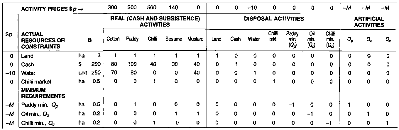 This type of subsistence-oriented farm planning problem is set up for LP as was the problem of Table 9.9, but with certain modifications. An example is shown in Table 9.12. The steps are summarized as follows: