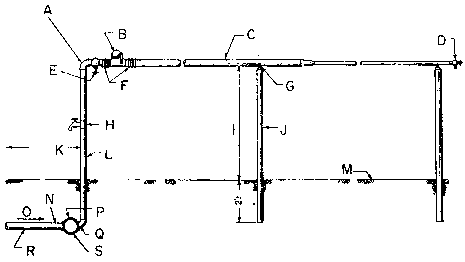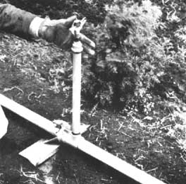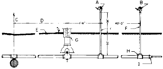 Beaucoup de pépiniéristes donnent la préférence aux rampes d'arrosage horizontales installées de façon permanente, équipées d'oscillateurs qui fonctionnent par la pression de l'eau. Les rampes représentées dans la figure 1 sont à une hauteur de 3 feet (1 m) au-dessus du sol. Pour éviter les dégâts du gel, cette installation est munie d'un robinet d'arrêt-purgeur, placé au-dessous de la surface du sol, qui permet la vidange automatique du tuyau d'amenée. Si une protection automatique contre le gel n'est pas nécessaire, une vanne ordinaire placée entre le tuyau d'amenée et l'oscillateur constitue un dispositif aussi bon et moins coûteux. Sur les amenées temporaires, des robinets à fausset constituent également un dispositif commode (figure 2).